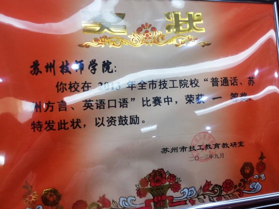 金秋时节,桂花飘香。9月25日下午,2013年全市技工院校“普通话、苏州话、英语口语"比赛在苏州技师学院隆重举行。经过三个多小时的激烈比拼,一、二、三等奖争先出炉,其中,苏州技师学院的选手们不负众望,在此次比赛中取得了一等奖的好成绩。