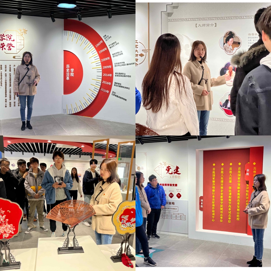 支部党员余慧娴担任讲解,她结合学院育人实际和重点工作内容,带领学生逐一参观了党群服务中心初心·匠心馆内七个区域,包括“序言区”“匠志区”“匠品区”“匠艺区”“匠心区”“匠能区”和“信仰区”。余老师用生动的讲解回顾了学院发展的历史,介绍了学院党建工作特色、立德树人的主要工作以及工艺传承的创新举措,展示了学院培养优秀教师和优秀技能人才上取得的成果。参观过程中,学生沉浸其中,对各项成果赞叹不已,深刻感受了在党的领导下学院取得的成就。